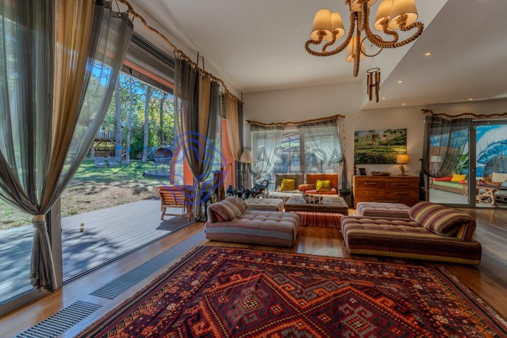 Generous living room with 72 m², fireplace with heat recovery system, abundant natural light and direct views of the garden and pool